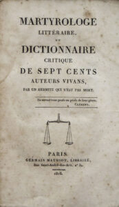 Au cours de l'année 1817 sort à Paris un curieux petit livre au titre intriguant de Martyrologe (sic) littéraire. L'auteur anonyme s'abrite derrière le pseudonyme à la mode d'"ermite". Popularisé en 1811 par Étienne de JOUY grâce à sa chronique L'Hermite de la Chaussée-d'Antin, ce…
