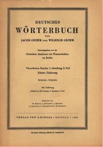 Jacob et Wilhelm se sont partagé le travail – le premier s’occupant du A, du B et du C, tandis que le second, apparemment plus lent, se consacre au D ; chacun s’abstenant par accord tacite de commenter son travail et celui de l’autre. Au fil des ans, la rédaction n’avance que très lentement, d’autant que d’autres occupations viennent périodiquement les distraire de leur tâche, en particulier la participation de Jacob comme député à l’éphémère parlement de Francfort en 1848. Leurs efforts finissent par payer et, en mars 1852, un prospectus annonce les premières livraisons. Le premier tome complet (ci-dessous) est publié par HIRZEL le 13 avril 1854, soit presque 16 ans après le lancement du projet.