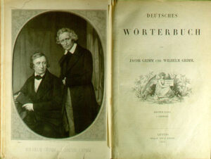 Mais loin de se contenter de n’être que des conteurs, les deux frères, toujours inséparables même après le mariage du plus jeune, sont aussi des linguistes et des philologues. À l’origine, leur travail sur les contes s’inscrit dans une perspective historique et linguistique de la langue allemande. C’est comme linguistes que, dans les pays germanophones, les GRIMM restent associés à un grand projet lexicographique qui n’aboutira que bien plus tard, le Deutsches Wörterbuch (Dictionnaire allemand), familièrement appelé le DWB, mais baptisé aussi le “Dictionnaire de Grimm” en l’honneur de ceux qui ont initié sa rédaction.