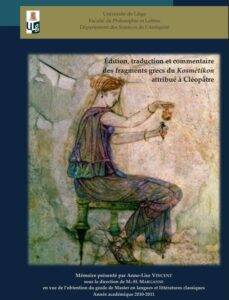 Pour aller plus loin, nous vous renvoyons vers Le dossier des ouvrages médicaux attribués à Cléopâtre, de Marie-Hélène MARGANNE, et Édition, traduction et commentaire des fragments grecs du kosmètikon attribué à Cléopâtre (ci-dessous), d’Anne-Lise VINCENT.