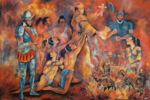 Mais LANDA ne s’arrête pas là. Au cours des interrogatoires, fouilles et perquisitions, de nombreux artéfacts sont saisis. Il fait alors dresser un bûcher sur la grande esplanade de Mani pour immoler, de manière spectaculaire, ces reliques de l’ancien temps. Le 12 juillet, au cours d’une terrible cérémonie qui a, selon les mots mêmes de notre incendiaire, “profondément attristé et peiné” les Indiens présents, ce sont près de 5 000 sculptures diverses, 197 vases et surtout 27 “rouleaux de signes et de hiéroglyphes” qui partent en fumée. Ci-dessous, une saisissante représentation moderne de l’événement, réalisée en 1998 par l’artiste local Leonardo PAZ.