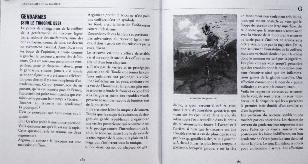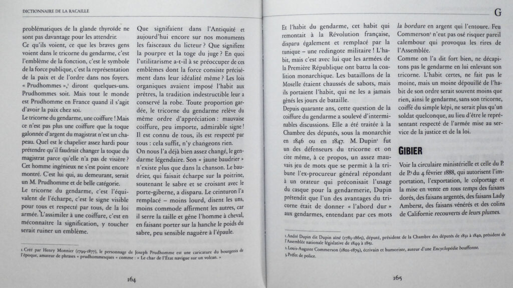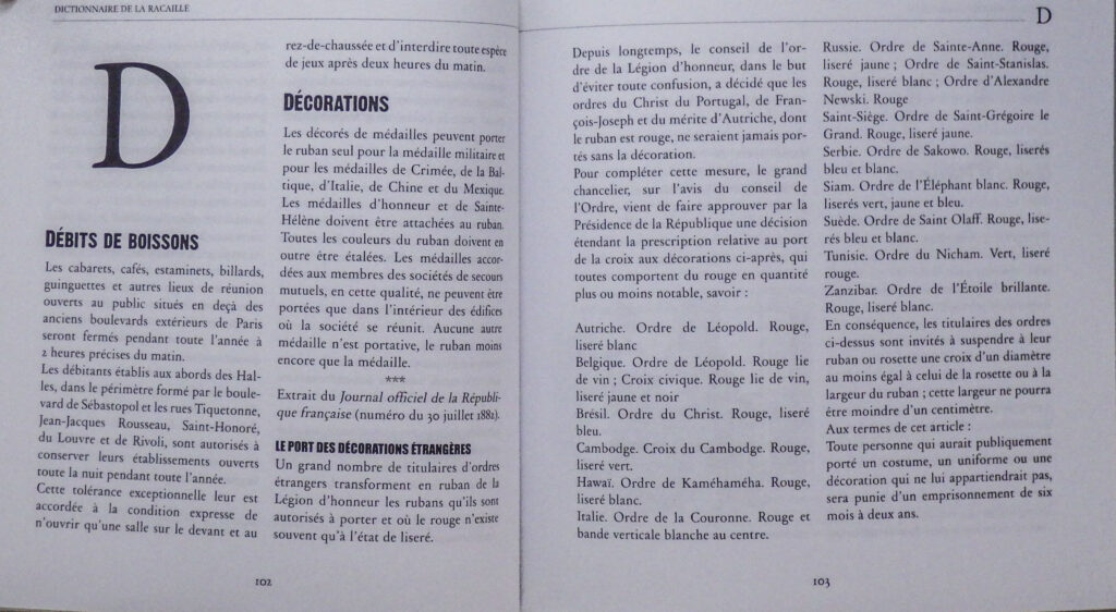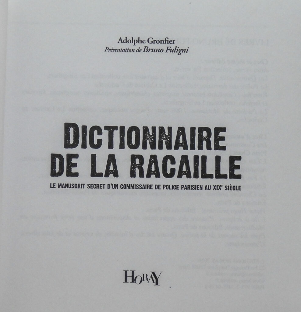 Lorsqu’il parcourt les pages de sa nouvelle acquisition, JUBERT constate que le livre, presque entièrement annoté, apporte un témoignage inédit et original sur la délinquance et le crime organisé dans le Paris de la fin du XIXe siècle. Il y glane ainsi beaucoup d’informations qui lui serviront pour écrire ses romans, mais il prend également conscience qu’il est en possession d’un document unique qui mérite d’être découvert par le plus grand nombre. Il confie alors ses volumes à Bruno FULIGNI, historien et écrivain, qui retrouve la trace de l’auteur de ce dictionnaire clandestin. Grâce aux indications portées sur le livre, et en particulier aux tampons de deux commissariats parisiens des quartiers de Picpus et de Grenelle, il remonte la piste de son ancien propriétaire. Celui-ci, qui avait pris soin de laisser son nom sur le dictionnaire, sera aisément identifié dans les registres de la préfecture de police de Paris. Séduit par le souci du détail et le style de GRONFIER, FULIGNI entreprend de faire publier le patient travail de l’ancien commissaire. Il reprend le texte manuscrit et le répartit ensuite en rubriques assorties d’explications complémentaires. C’est dans ces conditions que naîtra le Dictionnaire de la racaille publié par les éditions Horay en mars 2010.