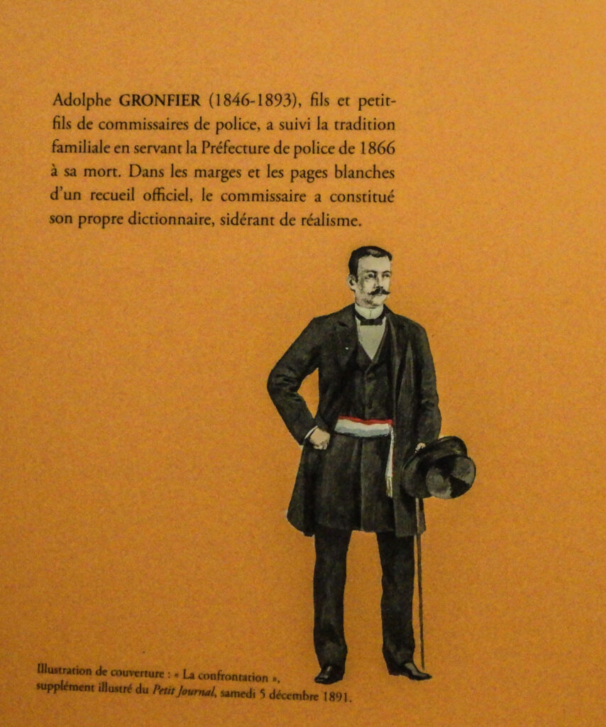 S’il n’a donc guère brillé dans ses obligations professionnelles, GRONFIER a un passe-temps qui lui vaudra, près d’un siècle après sa disparition, d’être tiré de l’oubli. En effet, notre commissaire rédige des annotations sur son exemplaire du Dictionnaire général de police administrative et judiciaire. Édité entre 1875 et 1878, cet ouvrage en deux volumes se présente sous la forme d’un recueil thématique de lois, de décrets, de circulaires et de règlements sur les sujets les plus divers. D’une écriture serrée, il a littéralement enchâssé, dans les articles officiels, des commentaires et des anecdotes de son cru. En 1998, Hervé JUBERT achète cet exemplaire dans une brocante sur un boulevard parisien. Diplômé de l’école du Louvre, travaillant pour le Collège de France et l’EHESS, il aspire à se lancer dans la littérature, en particulier dans ce qu’il est convenu d’appeler la littérature de genre ; c’est-à-dire la science-fiction, le fantastique et le roman policier.