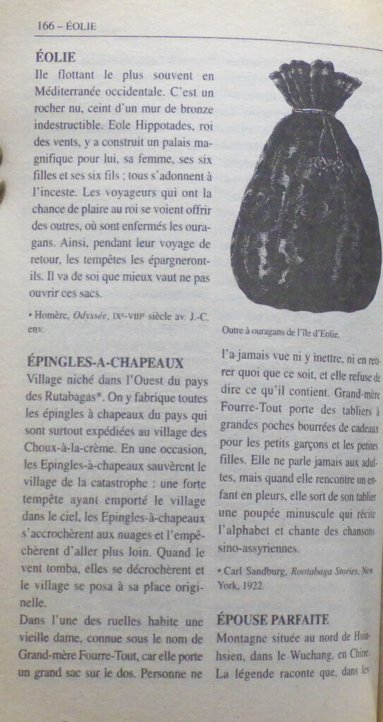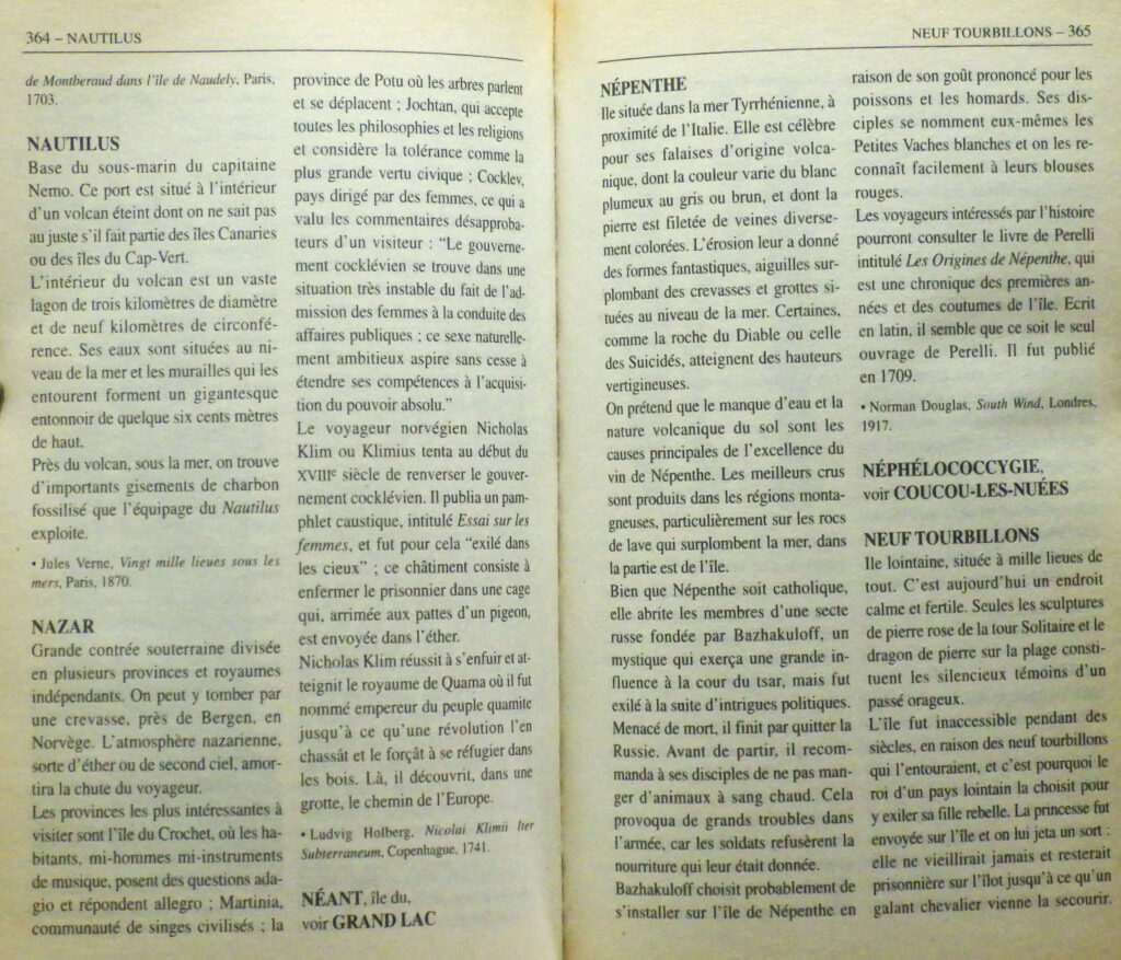 Finalement, MANGUEL et GUADALUPI décident de respecter une série de critères afin de limiter leur recherche. Les lieux retenus doivent être réellement imaginaires et ne pas se référer à des endroits réels utilisés comme décors de fiction. Ils écartent les enfers et les paradis des différentes religions, les villes, mais aussi les territoires inspirés par un ou plusieurs lieux dissimulés sous un pseudonyme, comme le Yoknapatawpha de FAULKNER ou le Balbec de PROUST. De manière plus discutable, ils conviennent de ne pas s’attarder sur les récits d’anticipation et d’uchronie basés sur le futur possible d’une société de l’époque contemporaine ; c’est ainsi qu’ils ne retiennent pas les mondes de Métropolis et de 1984. Les auteurs, qui reconnaissent avoir souvent fait preuve de subjectivité, assument aussi certaines absences, comme Gotham City. Au total, ce copieux recueil rassemble plus d’un millier de lieux imaginaires, soit à peine plus de la moitié des lieux candidats visités par nos deux “explorateurs de fictions“.