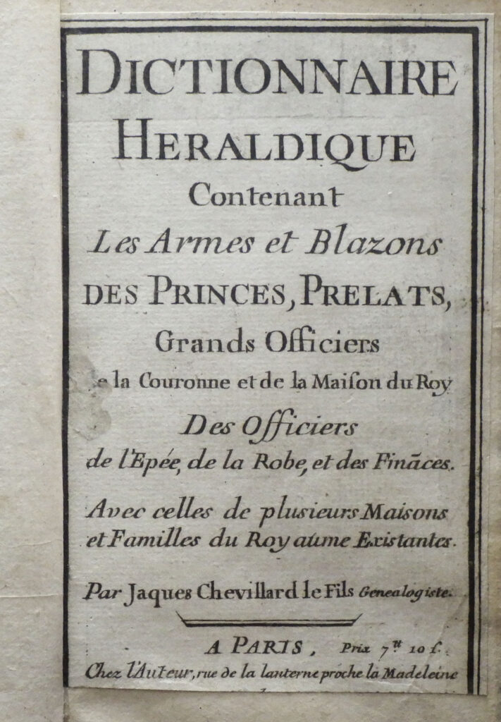 Dans les provinces, d’autres recueils de blasons sont réalisés à partir de rapports d’enquête commandés par les intendants ou les parlements. C’est dans ce cadre que l’historiographe du roi Jacques-Louis CHEVILLARD – lui-même fils d’un généalogiste renommé – en signe plusieurs dédiés à la Bourgogne et la Bresse, la Normandie, ou encore Paris. En 1722, il propose un ouvrage de synthèse sobrement intitulé Dictionnaire héraldique ; il s’agit de l’ouvrage présenté ici. Dans sa préface, l’auteur explique clairement la motivation du choix de ce format. Pour lui, les traités et manuels existants sont obscurcis par beaucoup d’informations inutiles, obsolètes ou erronées qui rendent leur consultation délicate. Afin de fournir un outil pratique, maniable et fiable, il opte donc pour le format, supposé plus commode, du dictionnaire : “On a donc pensé qu’un dictionnaire pouvait seul prévenir cet inconvénient et, ayant vu la méthode introduite dans la république des lettres, avec une espèce de fureur de mode, de réduire en dictionnaires les principes et les termes des sciences et des arts, on s’est étonné que jusqu’à présent cette méthode n’eût pas été étendue et appliquée a l’art héraldique; à qui elle convient plus particulièrement qu’à toutes autres Sciences.”