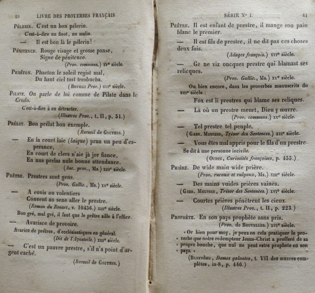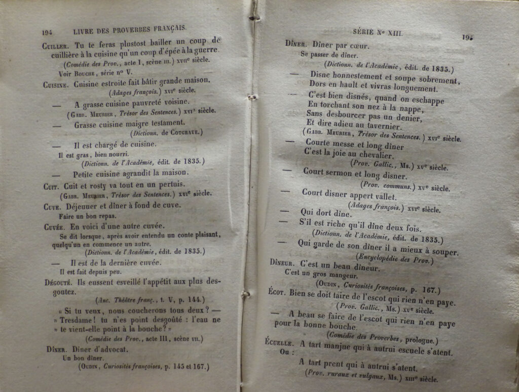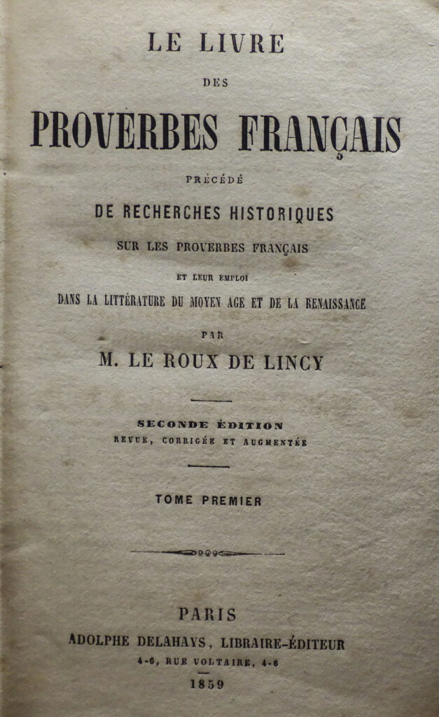 Après avoir accumulé de nouveaux matériaux, il rédige une seconde version revue, corrigée et augmentée, qui sera publiée en 1859 dans la collection Bibliothèque gauloise de l’éditeur Adolphe DELAHAYS ; il s’agit de l’ouvrage présenté ici. L’introduction de DENIS a été remplacée par un long texte de l’auteur : Recherches historiques sur les proverbes français et leur emploi dans la littérature du Moyen Âge et de la Renaissance. L’ouvrage se présente comme une vaste compilation de proverbes et d’expressions recueillies dans divers ouvrages tels que Curiosités françaises d’Antoine OUDIN ; Trésor des sentences dorées, dicts, proverbes & dictons communs de Gabriel MEURIER ; les romans de RABELAIS ; Le Dictionnaire étymologique, historique et anecdotique des proverbes et des locutions proverbiales de la langue française de Pierre-marie QUITARD ; le Proverbium vulgarium libri tres de Charles de BOVELLES ; les recueils de Jean GRUTER, ou encore des almanachs.