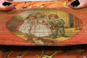 Jusqu’ici, nous avons parlé de dessins placés bien en évidence et directement visibles, mais il existe une autre technique, à vrai dire étonnante quand on n’est pas dans le secret, qui consiste à ʺenfouir” dans un ouvrage une image, réellement invisible quand il est fermé et sa tranche bien alignée. Pour faire apparaître le dessin, il faut soulever le plat de la reliure et, en appuyant uniformément sur l’ensemble des pages, les décaler afin que la tranche ne soit plus verticale mais oblique, et là, surprise, une scène peut apparaître sous vos yeux ! Pour bien comprendre la méthode, nous vous invitons à visionner la vidéo ci-dessous, qui propose un bon nombre d’exemples de dessins cachés. Il est à noter que la gouttière est prioritairement décorée, mais les tranches supérieures et inférieures peuvent aussi être peintes, ce qui nécessite alors que les pages soient tordues. Autre curiosité, il peut y avoir deux dessins différents qui apparaissent sur la même tranche selon que l’on déforme les pages dans un sens ou dans l’autre..