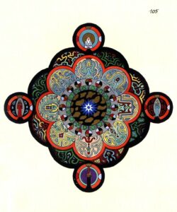 Autre curiosité du Livre rouge, on y trouve de fréquentes références à l’hindouisme, mais surtout au bouddhisme. En témoigne la présence de mandalas, qu’il considère comme des “cryptogrammes sur l’état de mon soi”. Cette figure deviendra par la suite centrale dans son travail d’analyse : “Ce n’est que lorsque je commençais à peindre les mandalas que je vis que tout chemin qu’il me fallait aller et chaque pas qu’il me fallait accomplir, que tout convergeait vers un certain point, celui du milieu. Je compris plus clairement que le mandala exprime le centre […] Il est le sentier qui mène vers le milieu, vers l’individuation.”