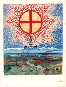Mais, quelques mois plus tard, lorsque la Première Guerre mondiale éclate, il fait le lien entre ses visions cauchemardesques et le chaos guerrier qui s’abat sur le continent. Comme le résumera plus tard l’universitaire Sonu SHAMDASANI, “il en vient à réaliser que nombre de ses visions intérieures ne concernent pas sa seule personne, mais qu’elles ont une portée prophétique, en lien avec les événements mondiaux. Il se dit alors que, si cela vaut pour certaines d’entre elles, peut-être que les autres sont, à leur façon, également véridiques”. Il entreprend alors de retravailler ses notes pour constituer la matière d’un projet de plus grande envergure, qu’il baptisera Liber Novus, soit Le Livre nouveau, mais qui sera couramment désigné comme Le Livre rouge (Das Rote Buch), en référence à sa belle reliure en cuir rouge (ci-dessous).