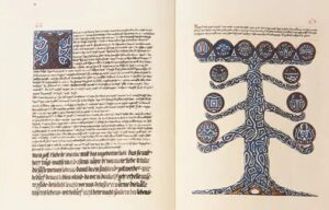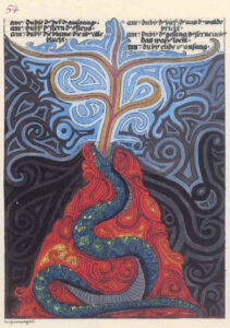 Au moyen de tableaux hallucinatoires ou cauchemardesques, notre psychologue développe une cosmologie souvent difficile à appréhender de manière rationnelle, et qui donnera lieu par la suite à bien des interprétations et des analyses. Pour sa part, JUNG écrira dans son autobiographie : “Dans la mesure où je parvenais à traduire en images les émotions qui m’agitaient, c’est-à-dire trouver les images qui se cachaient dans les émotions, la paix intérieure s’installait.” Il n’en reste pas moins que ces dessins fantasmagoriques, qui ressemblent parfois à des représentations alchimiques, que l’on peut rapprocher des courants symbolistes et surréalistes, offrent une plongée saisissante et inédite dans le monde intérieur et la psyché d’un “rêveur lucide“. Dans son manuscrit, certains thèmes reviennent fréquemment, comme celui des dragons et serpents, des héros armés, d’une nature exubérante et menaçante, telle ci-dessous la représentation d’un arbre gigantesque et “cosmique” qui n’est pas sans rappeler l’Yggdrasil des Vikings.