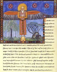 Divers personnages peuplent ces visions, dont celui que JUNG a baptisé PHILÉMON “père des prophètes“, ici représenté sous la forme d’un vieillard ailé et barbu.